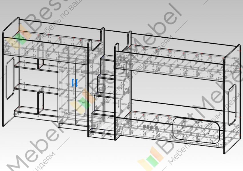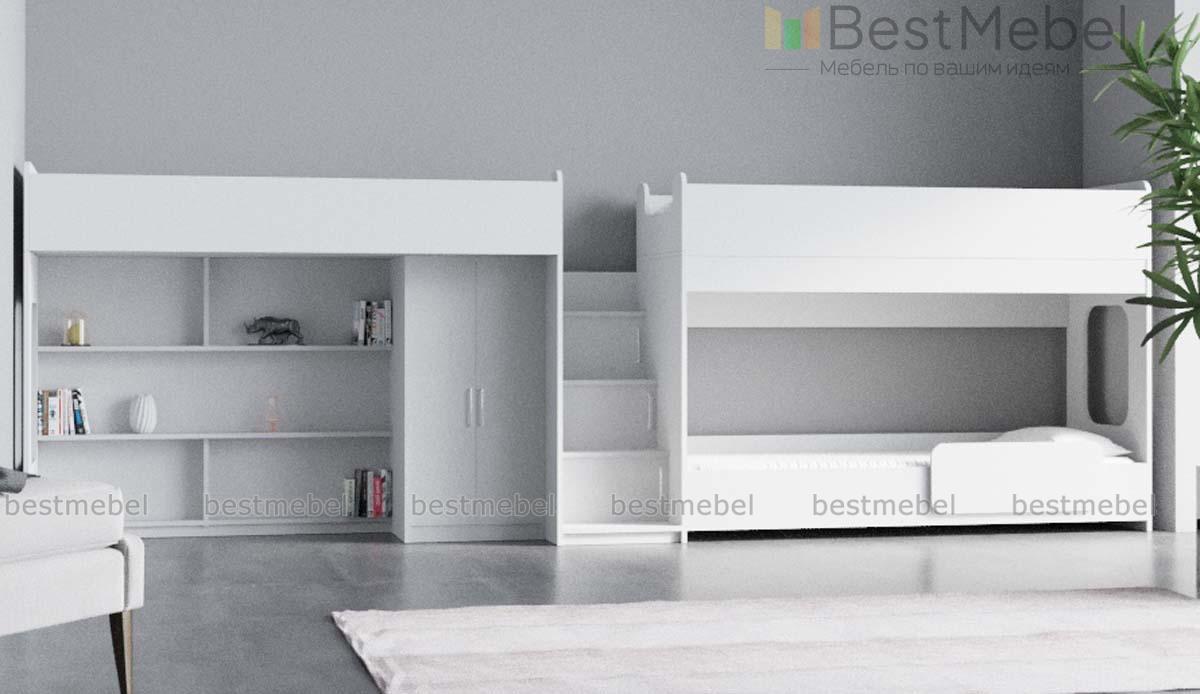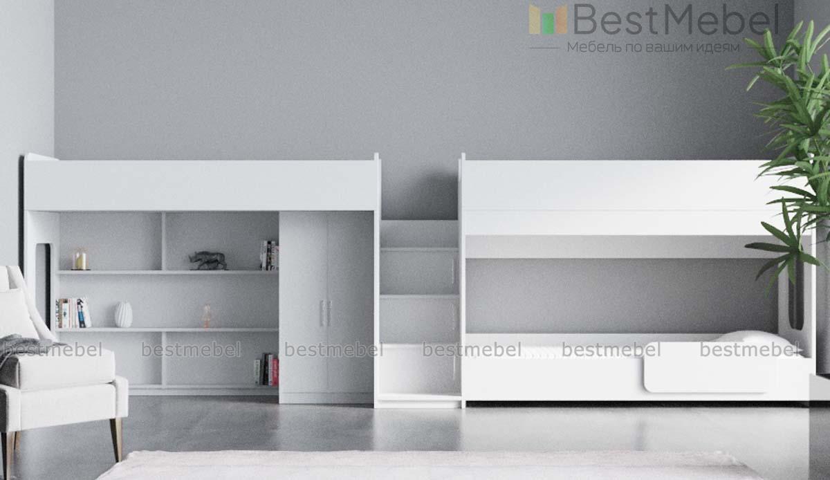 Трехъярусная кровать Миф 43.1.5 BMS объединила комфортную зону отдыха с игровой и удобной системой хранения. Продуманная композиция включает в себя двухъярусную кровать и кровать-чердак, на первом ярусе которой располагаются распашной шкаф для одежды и книжные полки, и лестницу-стеллаж с ящиками под ступеньками. Улучшат освещенность световые окна, а безопасность детям обеспечат защитные бортики и скругленные углы. Купить трехъярусную кровать Миф 43.1.5 BMS вы сможете в нашем интернет-магазине, подобрав цветовое решение.