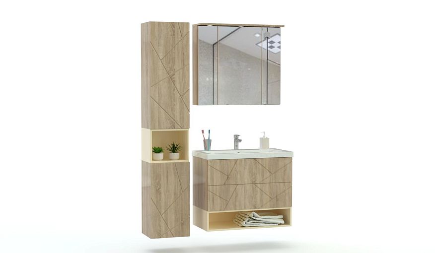 Мебель для ванной Альта 2 BMS – это актуальный дизайн и практичная подвесная конструкция, облегчающая уборку и позволяющая сэкономить пространство. В комплект входят тумба под раковину с двумя выдвижными ящиками и нишей, комбинированный пенал и трехстворчатый зеркальный шкафчик. Фасады предметов в древесном цвете декорированы геометричной фрезеровкой и дополнены ванильными акцентами. Купить мебель для ванной Альта 2 BMS по выгодной цене вы сможете в нашем интернет-магазине.