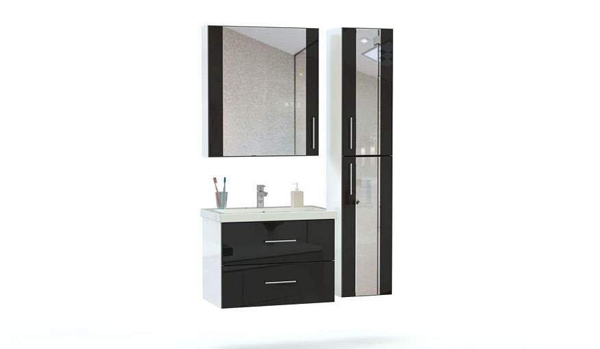 Мебель для ванной Шелти 3 BMS сочетает в себе функциональность и яркий дизайн. Подвесная композиция включает в себя тумбу под раковину с двумя выдвижными ящиками, двухдверный пенал и зеркальный шкаф, незаменимый для хранения базовых уходовых средств. В оформлении фасадов скомбинированы черный глянец, зеркала и хромированная фурнитура, влагостойкие поверхности надолго сохранят эстетичный вид. Купить мебель для ванной Шелти 3 BMS с возможностью изменения цвета и размеров приглашаем к нам в интернет-магазин.