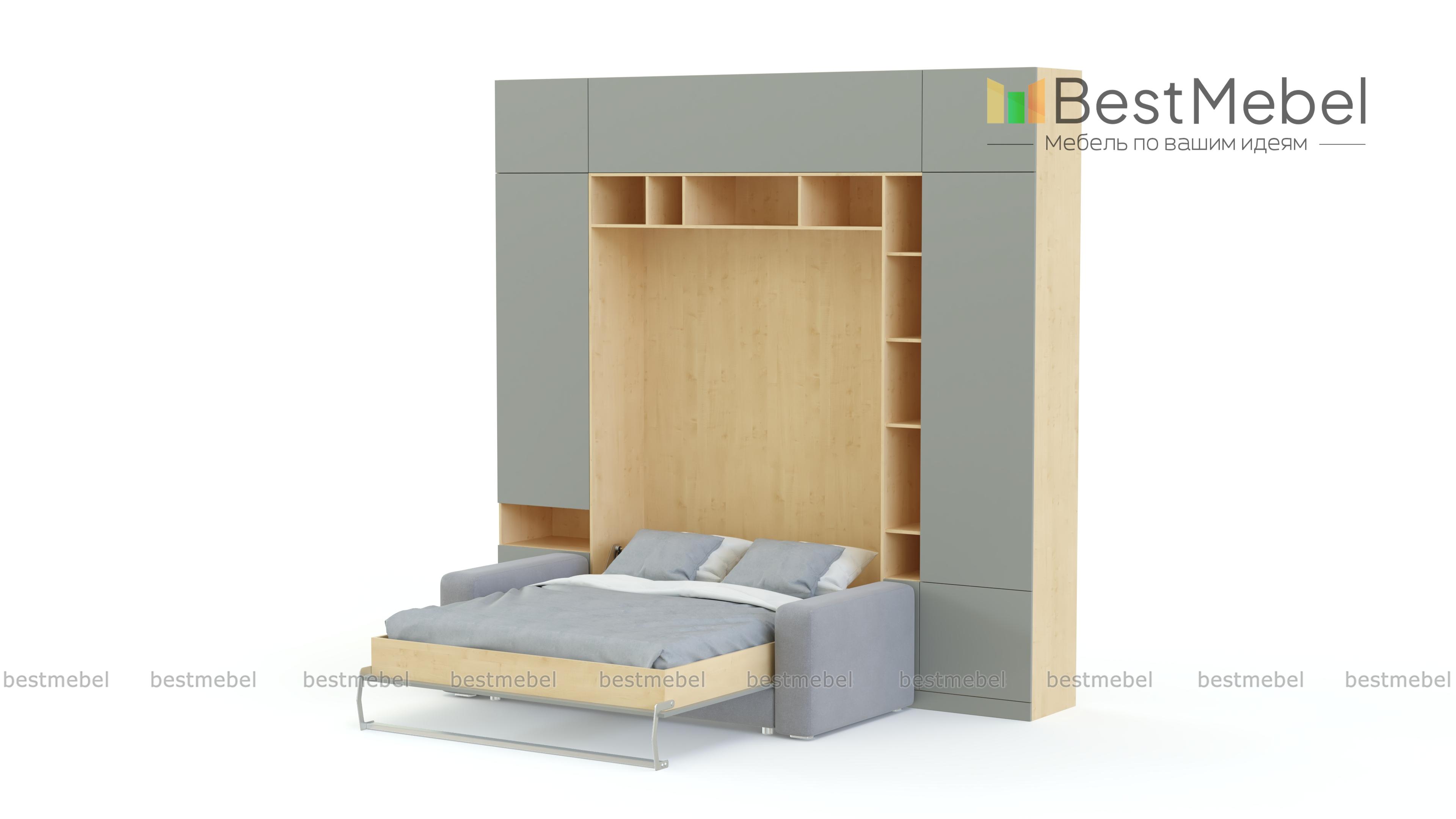 Шкаф-кровать Тида 06 BMS по достоинству оценят владельцы малогабаритных квартир и студий. Создать функциональный, визуально легкий и светлый интерьер в стиле минимализм поможет вам композиция 3 в 1. Стенка с белоснежным глухим фасадом, дополненным цветными вставками открытых полок, оборудована удобной системой хранения и модулем с откидной кроватью, а комфортный отдых подарит уютный мини-диван. Полноценное спальное место вы получаете при помощи надежного вертикального механизма. Купить шкаф-кровать Тида 06 BMS приглашаем в наш интернет-магазин.