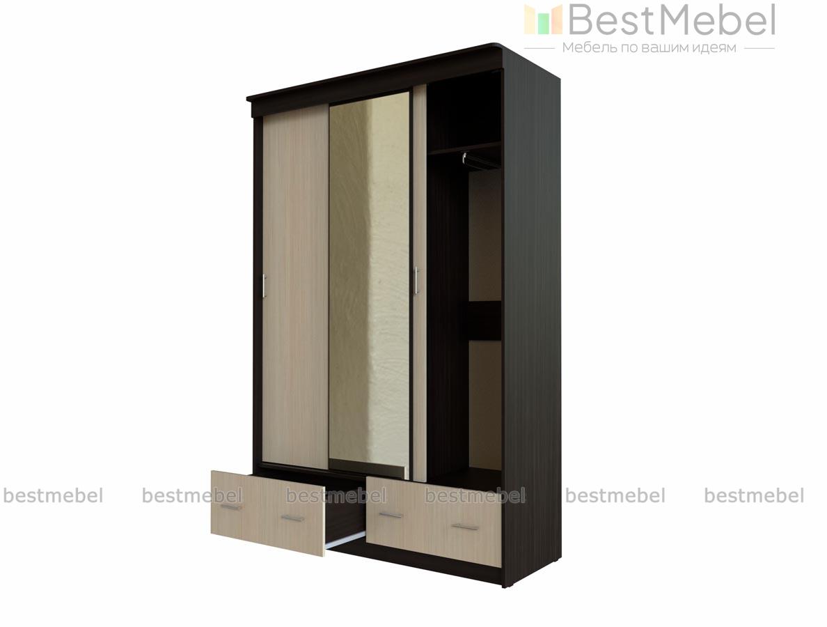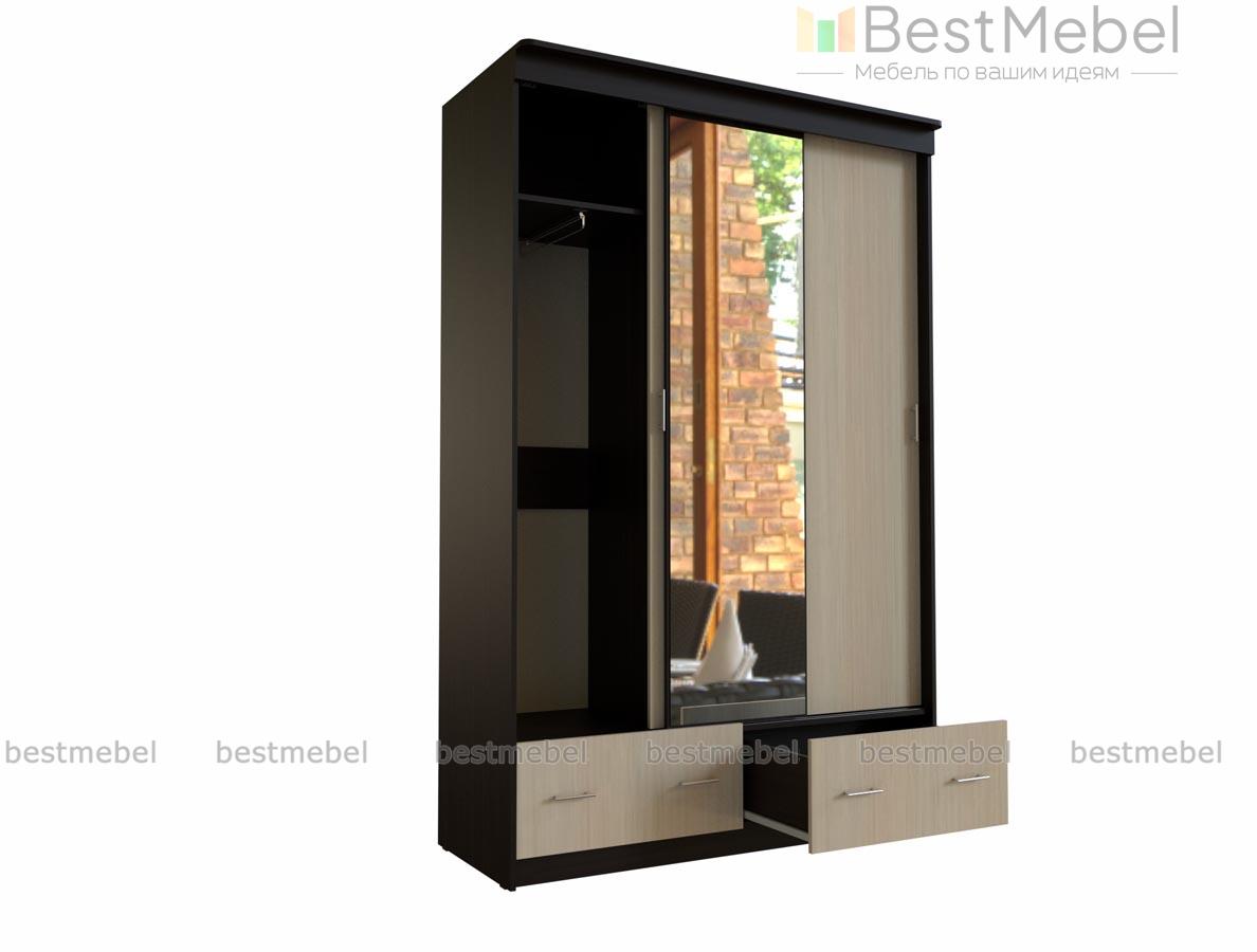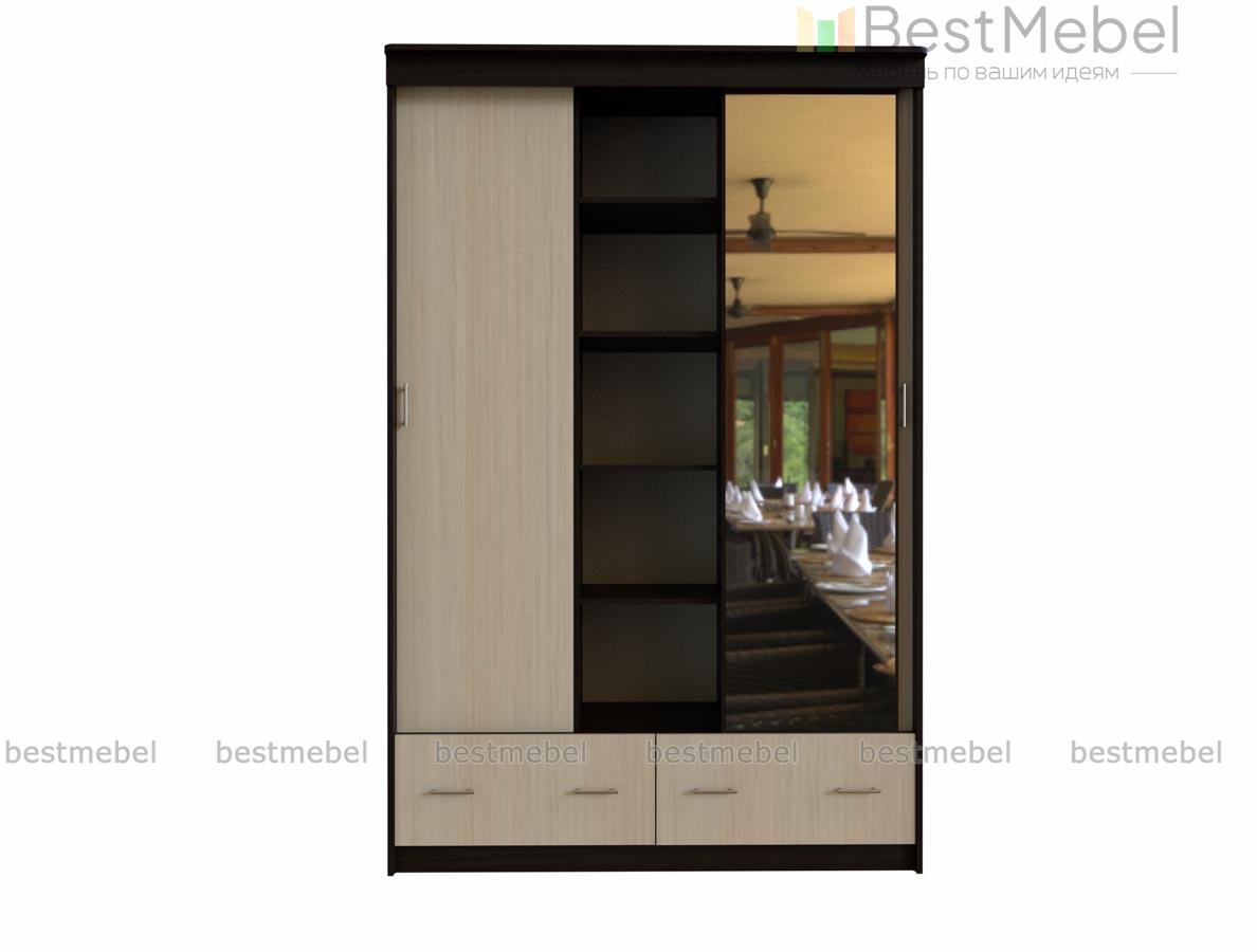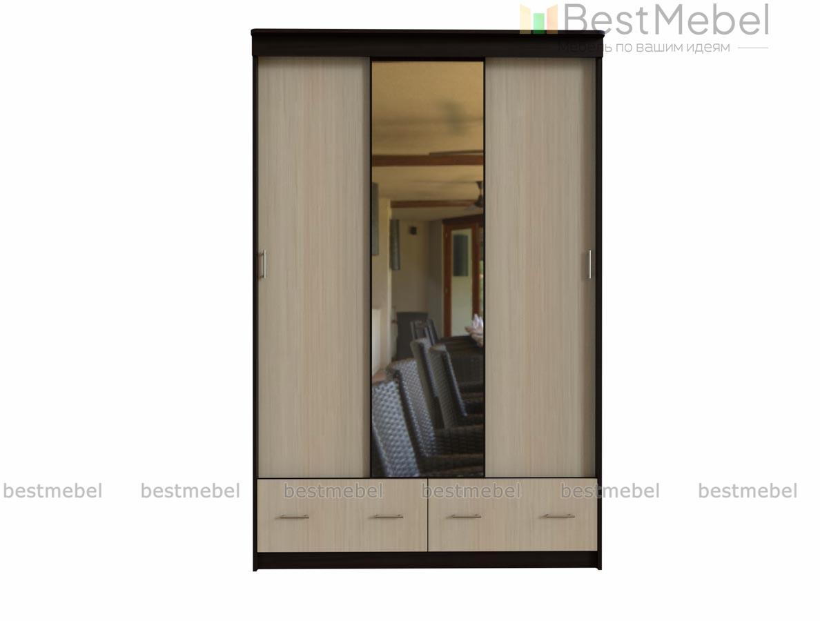 Шкаф-купе Млечный 5 BMS особенно вместителен благодаря комбинированной конструкции. Трехдверное отделение-купе дополнено двумя просторными выдвижными ящиками, оснащенными парными ручками-рейлингами. Корпус в темных древесных тонах скомбинирован со светлым фасадом, полностью зеркальная центральная створка визуально расширяет границы комнаты. Купить шкаф-купе Млечный 5 BMS с учетом необходимых размеров вы сможете на сайте нашего интернет-магазина.
