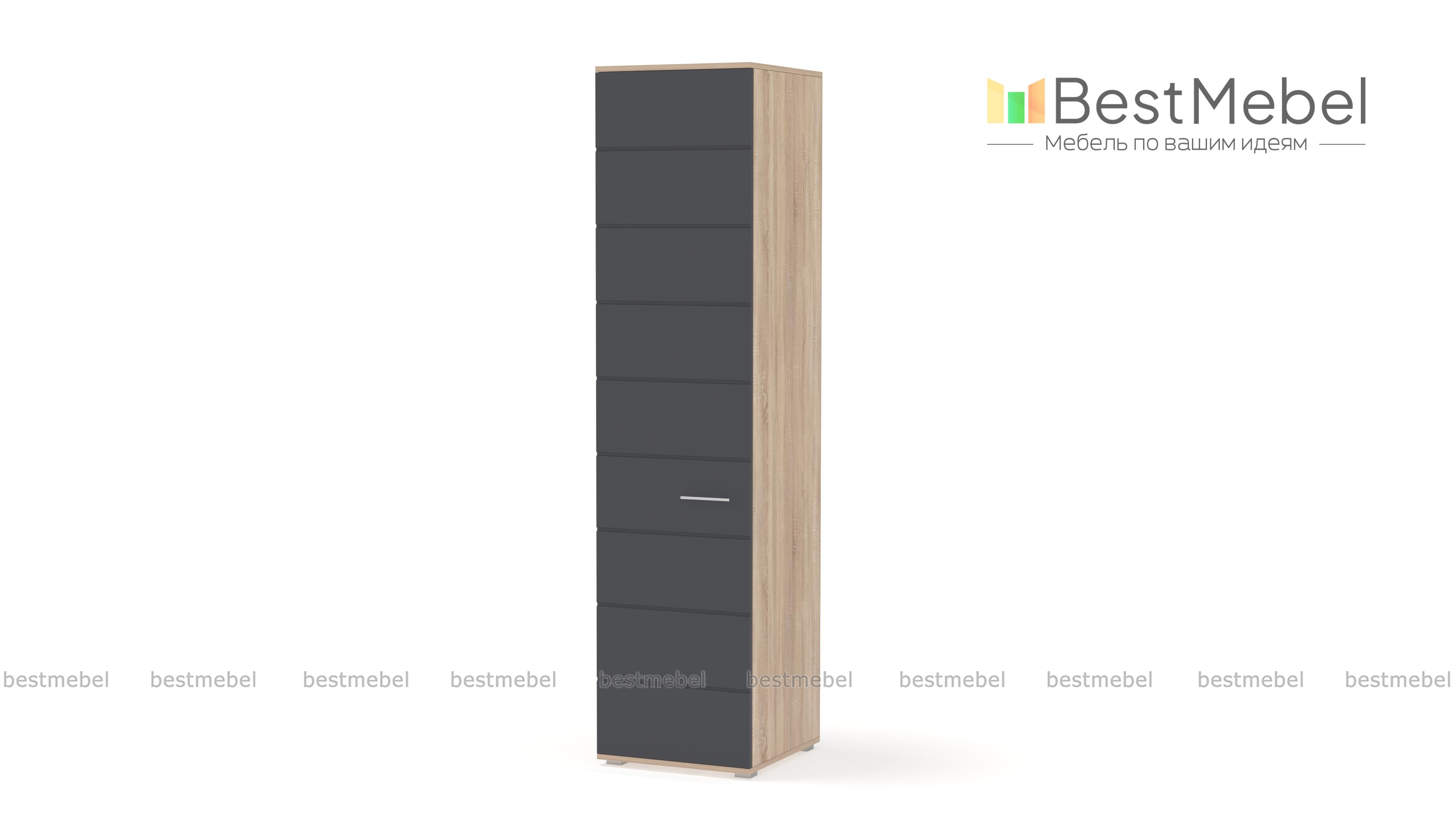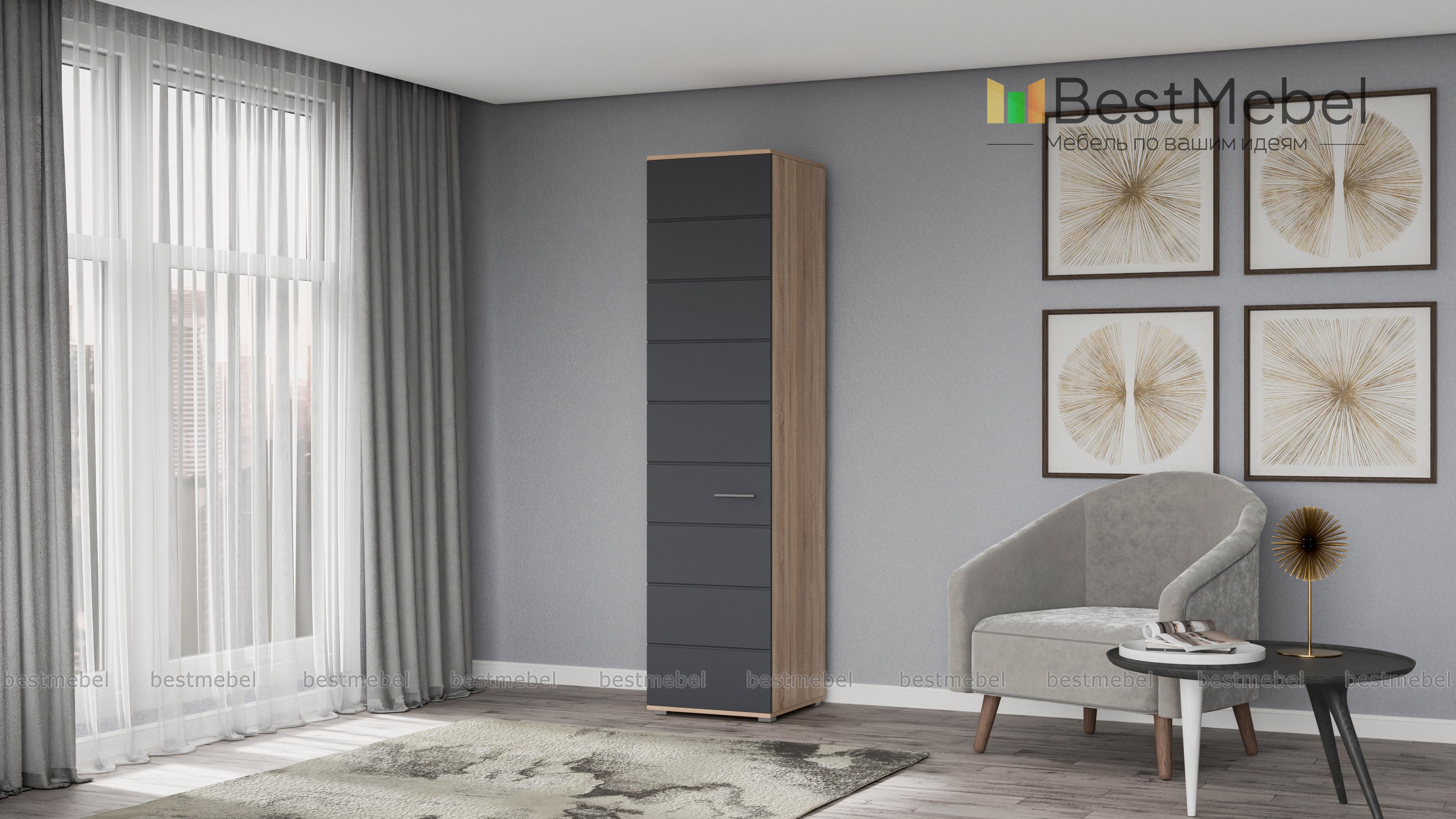 Пенал САМБА с полками BMS – лаконичная модель для спальни или гостиной в стиле минимализм. Компактный однодверный пенал выполнен в модной контрастной гамме – корпус темных оттенков и белый матовый фасад, декорированных горизонтальной фрезеровкой. За распашной дверцей находятся четыре вместительные полки, на которых удобно разместятся предметы гардероба и прочие домашние мелочи. Купить пенал САМБА с полками BMS по демократичной цене вы сможете в нашем интернет-магазине.