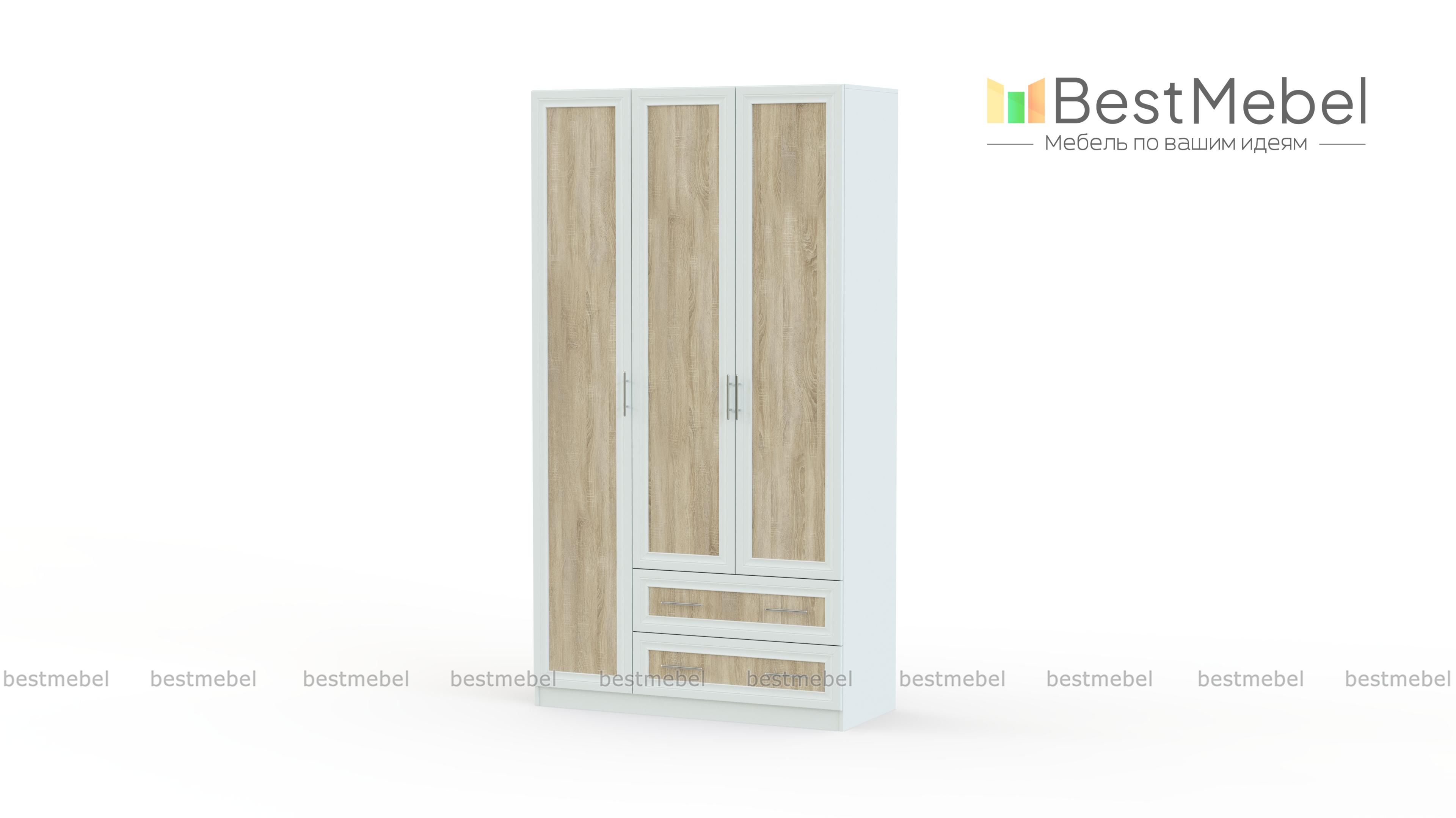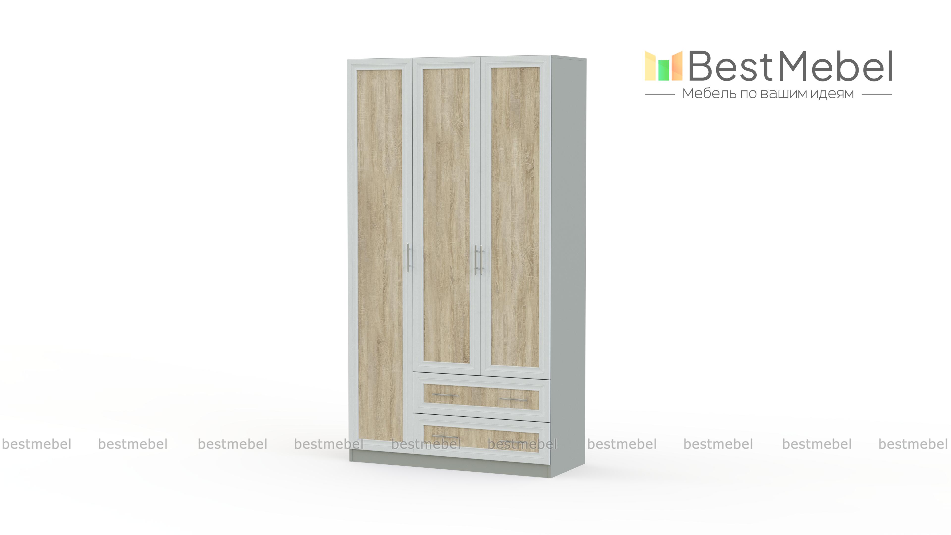Распашной шкаф Крона 23 BMS – простая и элегантная современная классика, которая гармонично дополнит домашний интерьер, сделав его не только функциональным, но и уютным. Трехдверная модель с рамочными фасадами выполнена в контрастных оттенках и дополнена удобными ручками-рейлингами. За распашными дверцами располагаются платяное отделение со штангой и полкой и бельевая секция. Два просторных выдвижных ящика в основании позволят аккуратно разместить мелочи. Купить распашной шкаф Крона 23 BMS вы сможете в нашем интернет-магазине.