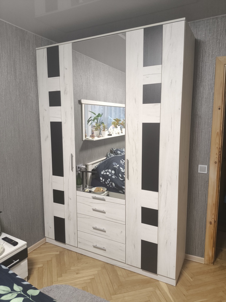 Шкаф вместительный, красивый, стильный. Большое зеркало зретильно увеличивает комнату. Она выглядит просторнее.