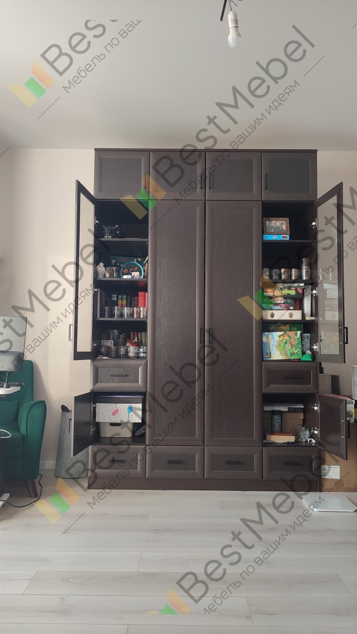 Шкаф распашной Фауст 4 BMS привлекает наличием разноплановых отделений, благодаря которым вы сможете компактно разместить одежду, книги, посуду, декоративные предметы и множество бытовых мелочей. Модель оборудована платяным двухдверным отделением, глухими секциями и витринами, выдвижными ящиками и просторной антресолью. Рамочные фасады с ручками-рейлингами выглядят элегантно в контрастных древесных тонах. Купить шкаф распашной Фауст 4 BMS для меблировки гостиной приглашаем в наш интернет-магазин.