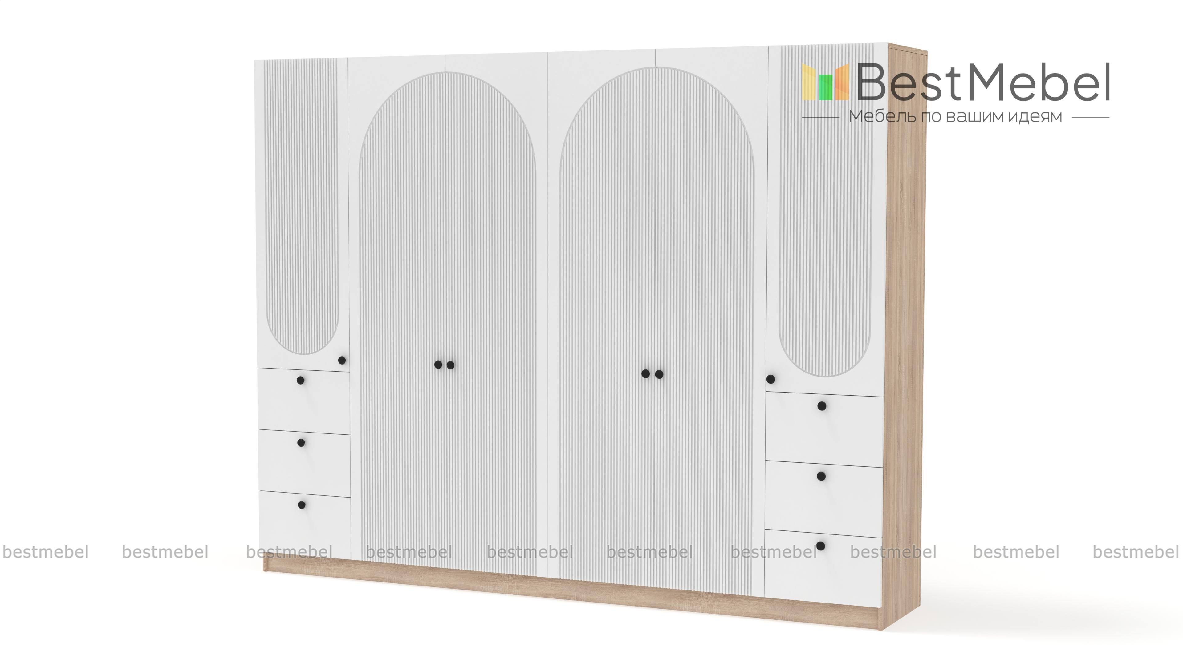 Шкаф распашной Вивьен 19 BMS с двумя платяными отделениями и двумя комбинированными легко и удобно разместит семейный гардероб. Габаритная конструкция для просторной спальни или прихожей оборудована штангами, бельевыми полками и шестью выдвижными ящиками. На фасаде из МДФ актуального оттенка — оригинальная геометричная фрезеровка и контрастные круглые ручки. Купить шкаф распашной Вивьен 19 BMS с изготовлением по индивидуальным размерам вы сможете на сайте нашего интернет-магазина.