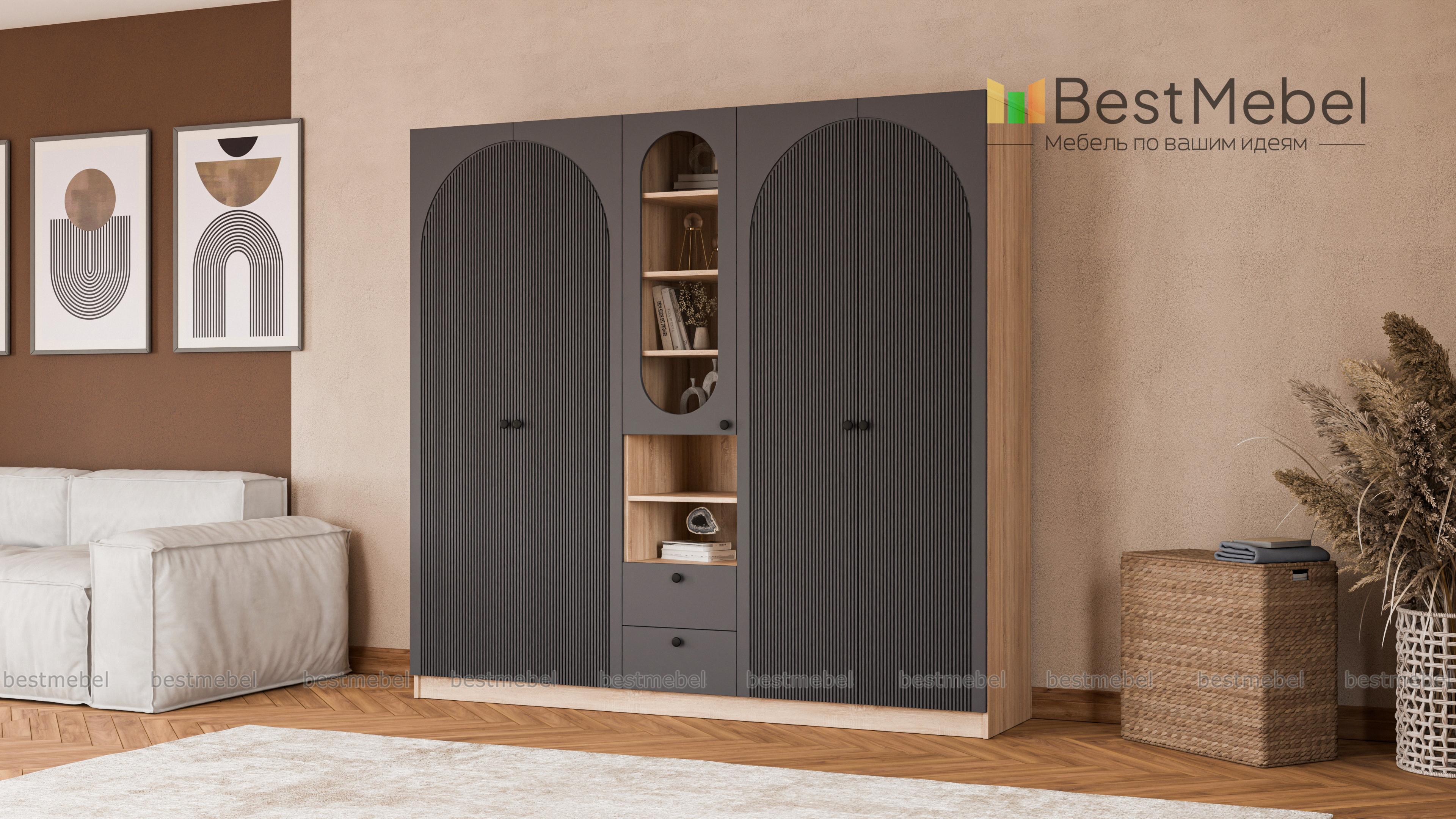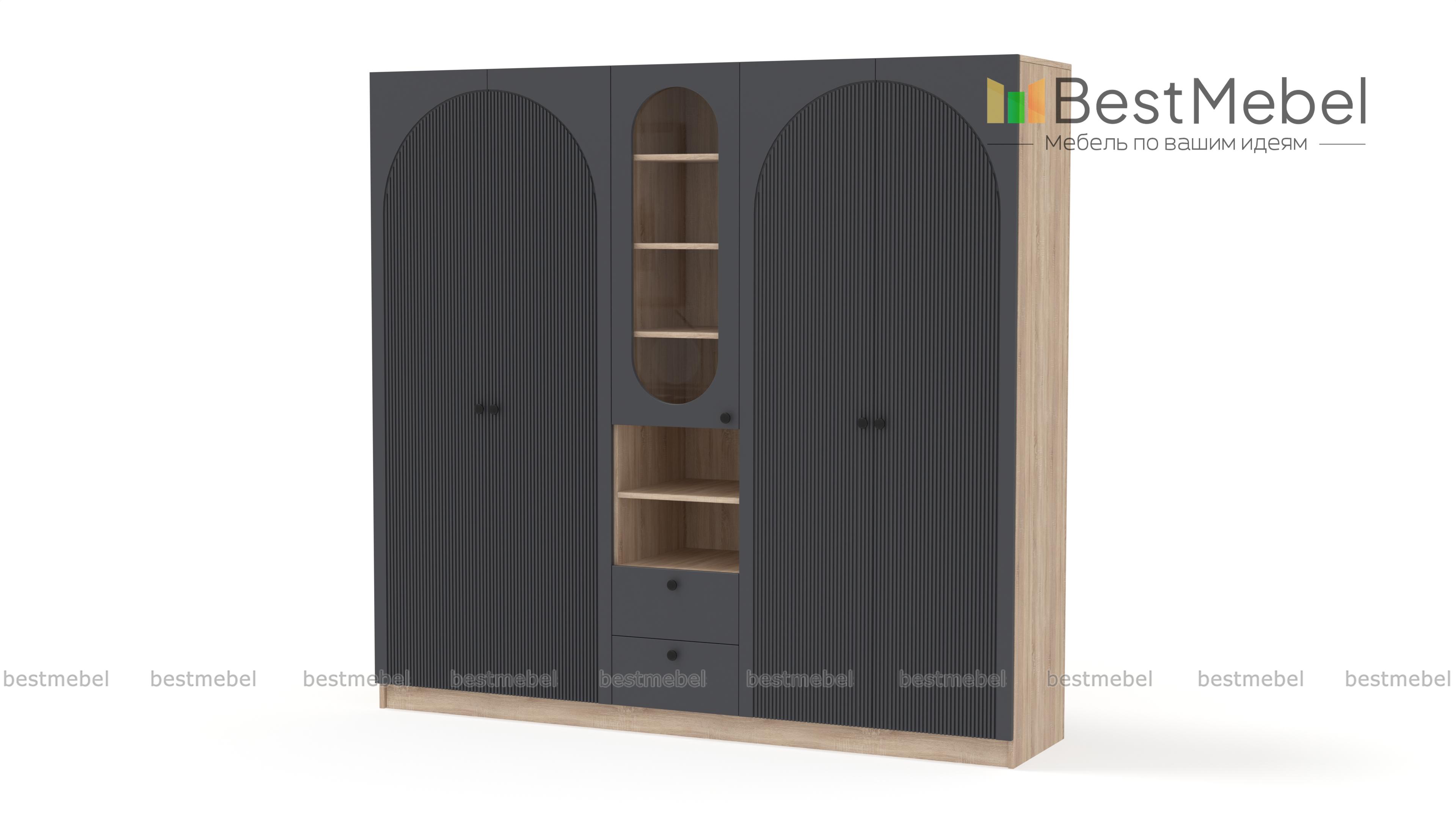 Шкаф распашной Вивьен 25 BMS — это два платяных отделения, витрина под книги и посуду, открытые полки и ящики для мелочей. Вместительная комбинированная модель сделает удобным хранение в гостиной, спальне или детской комнате. Корпус из ламинированной плиты красиво сочетается с нейтральным фасадом, фигурный вырез со стеклом повторяет форму декоративного рисунка на дверцах. Купить шкаф распашной Вивьен 25 BMS приглашаем в наш интернет-магазин, подобрав фурнитуру и цвет по каталогу.