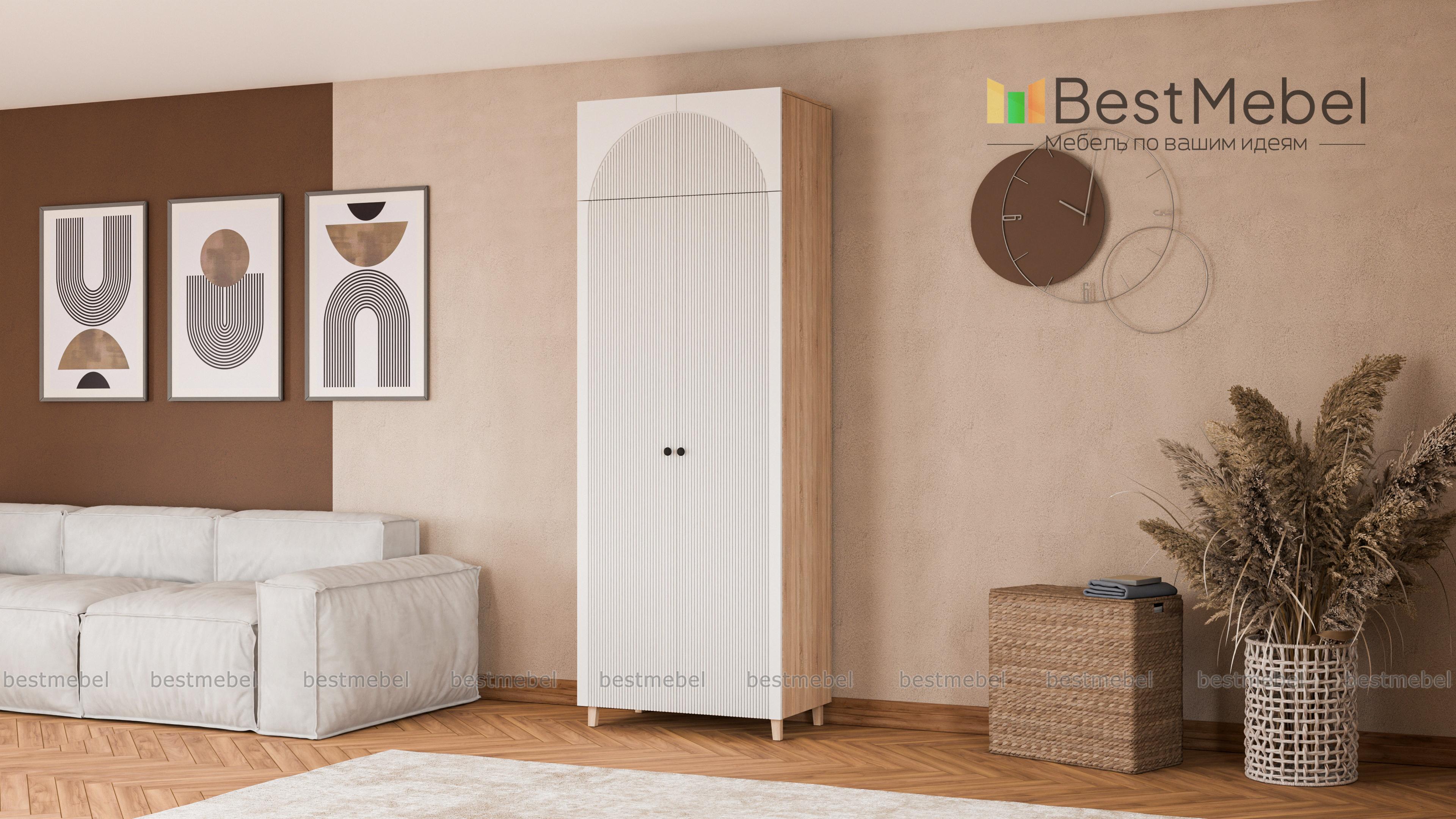 Шкаф распашной Вивьен 5 BMS сэкономит место и сохранит вещи в порядке. Высокая конструкция с деревянными ножками, просторной антресолью и штангой за двумя дверцами выручит вас, когда пространство комнаты ограничено. Стилистическим акцентом в интерьере современной квартиры станет оформленный трендовым рельефом фасад из МДФ. Купить шкаф распашной Вивьен 5 BMS вы сможете в нашем интернет-магазине с индивидуальным подбором размеров, цвета и наполнения.