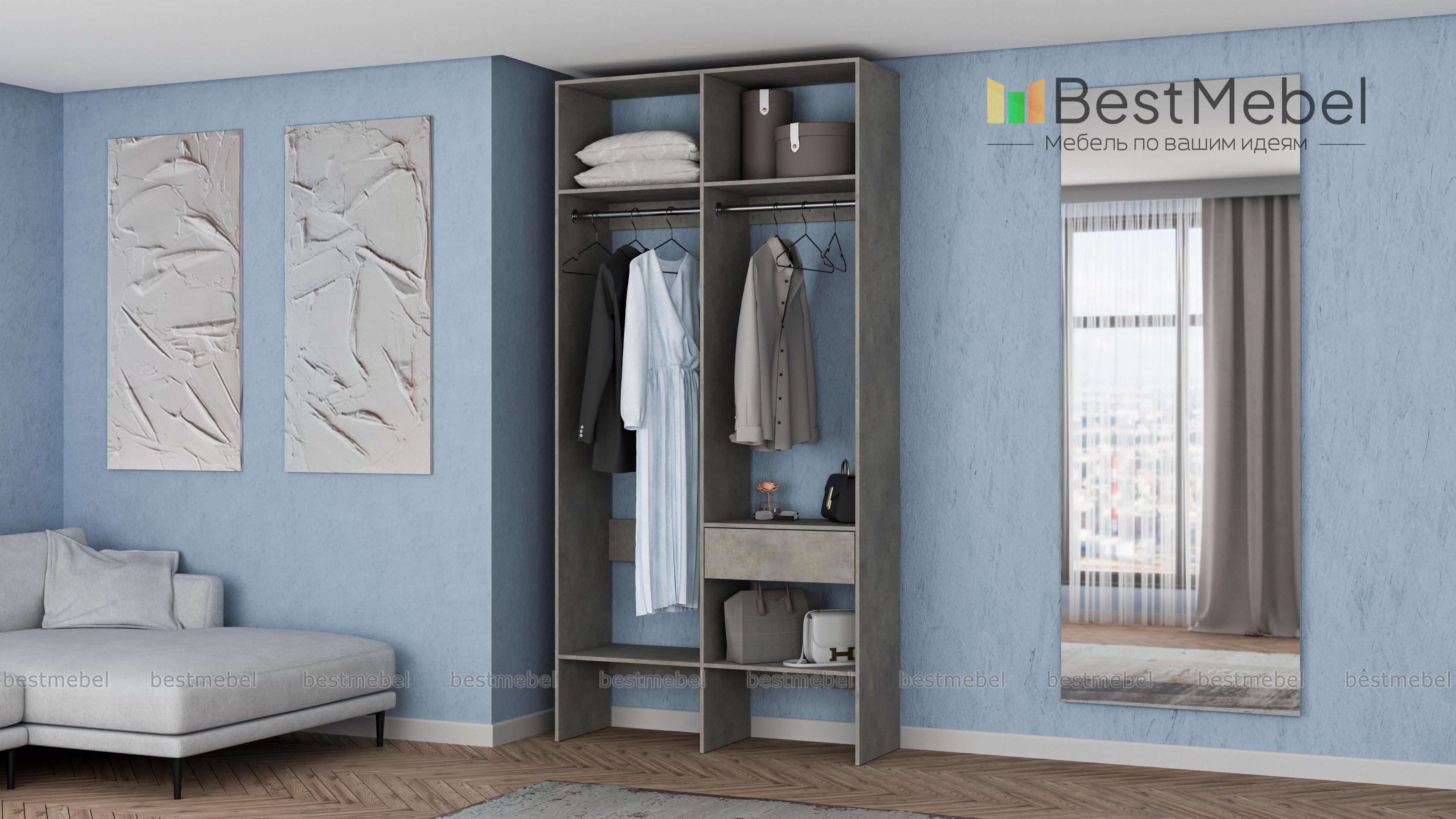 Стеллаж для одежды Мирта 42 BMS для гардеробной или прихожей выполнен в нейтральном светлом оттенке из ламинированной ДСП. Компактная и легкая двухсекционная конструкция объединила два платяных отделения разной высоты, верхние и нижние полки, а также выдвижной ящик, предназначенный для мелочей. В открытом стеллаже будут всегда на виду ваша повседневная одежда и обувь. Купить стеллаж для одежды Мирта 42 BMS вы сможете в нашем интернет-магазине, самостоятельно подобрав размеры и цвет.
