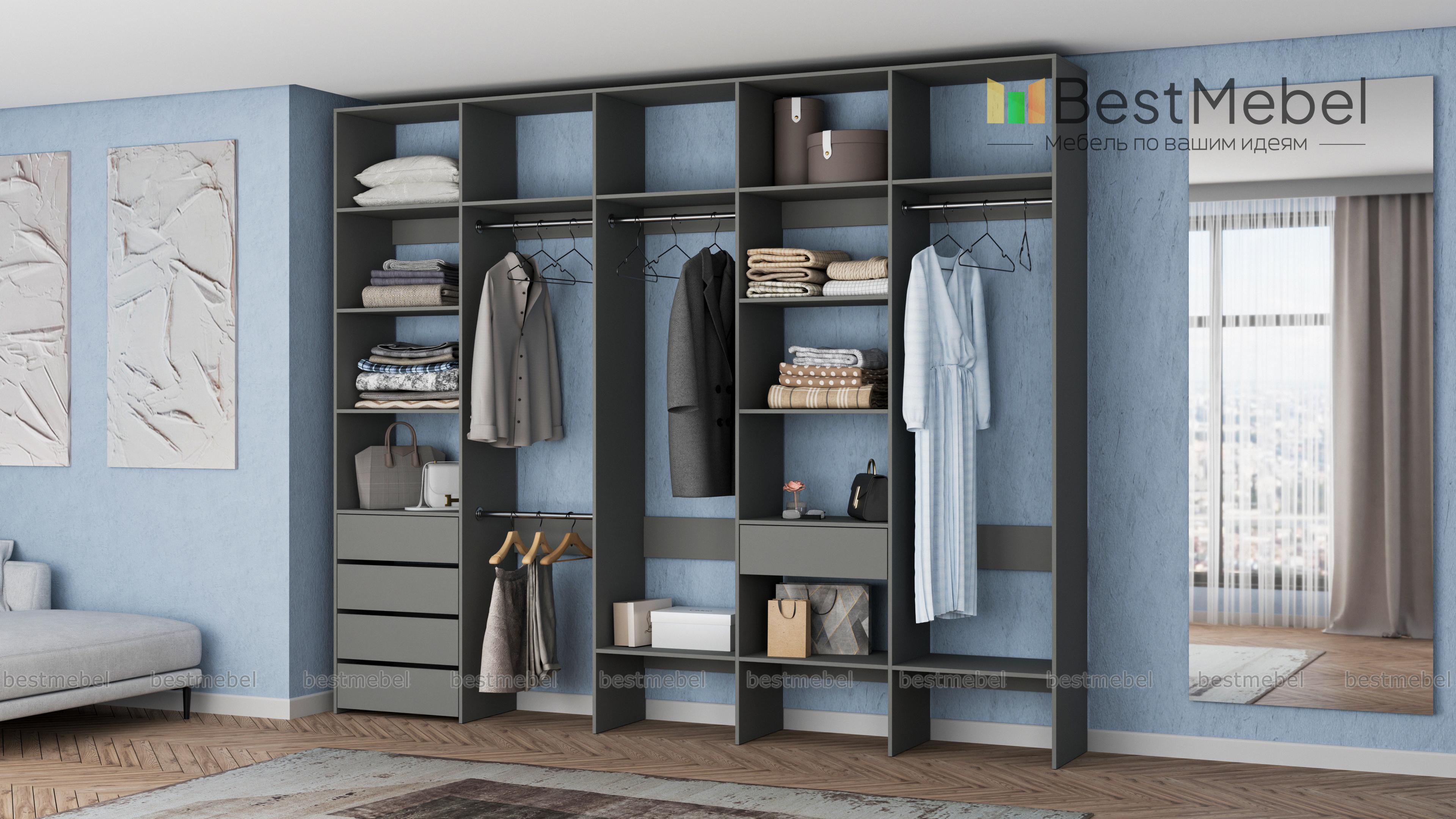 Стеллаж для одежды Мирта 73 BMS удобно зонирует пространство для хранения. Четыре штанги и полки позволят рассортировать одежду по категориям, расположенные на нижнем уровне полки удобны для создания обувниц, а в ящики можно убрать аксессуары, белье и другие мелочи. Дизайн стеллажа лаконичен и универсален, а поверхности из ламинированной ДСП устойчивы к влаге и появлению царапин. Купить стеллаж для одежды Мирта 73 BMS, изготовленный по вашим размерам, вы сможете в нашем интернет-магазине.