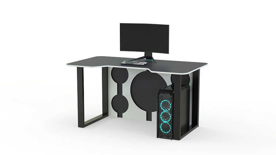 Геймерский стол Брук тип 8 BMS, выполненный в графитово-белой гамме, отличается ярким дизайном и эффектно дополнит интерьер в стиле хай-тек или индастриал. Модель располагается на устойчивых рамочных опорах и оборудована задней стенкой с декоративными круглыми вырезами. Просторная столешница безопасно скруглена по углам и имеет эргономичный вырез в передней части. Купить геймерский стол Брук тип 8 BMS для игры, учебы или работы вы сможете в нашем интернет-магазине.