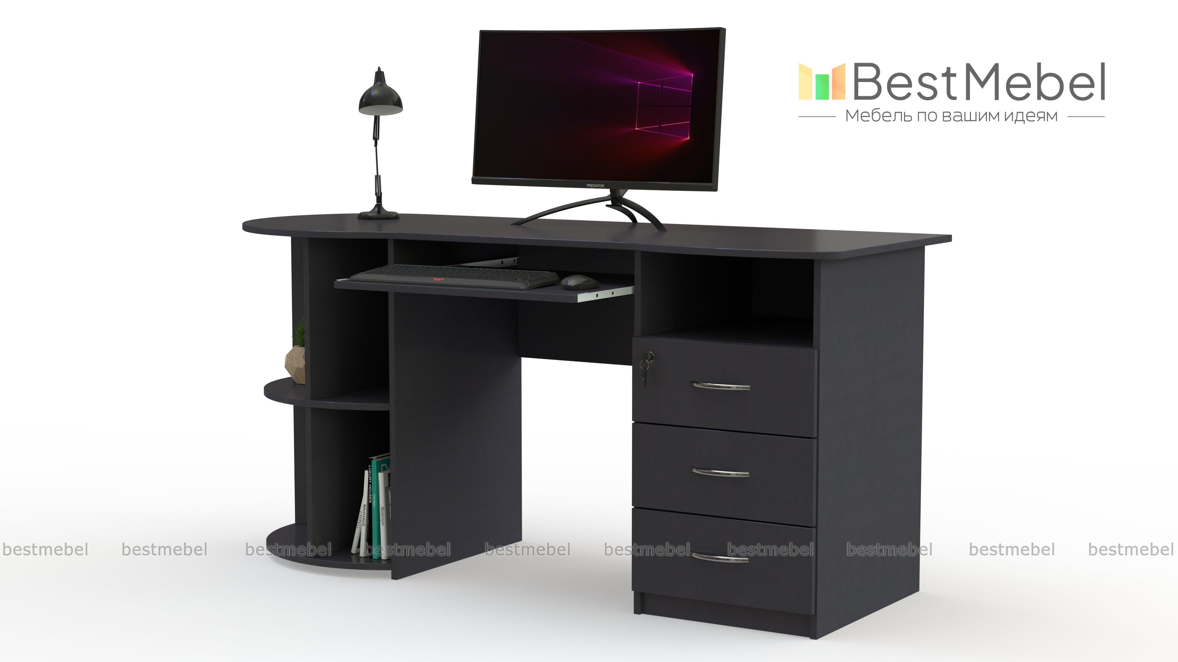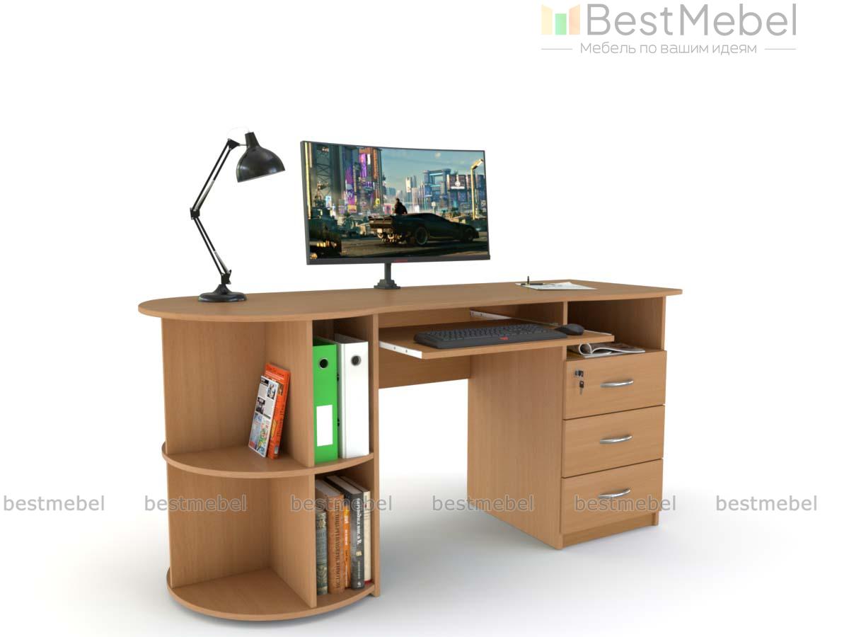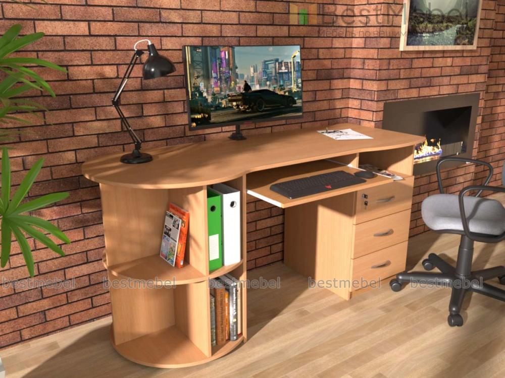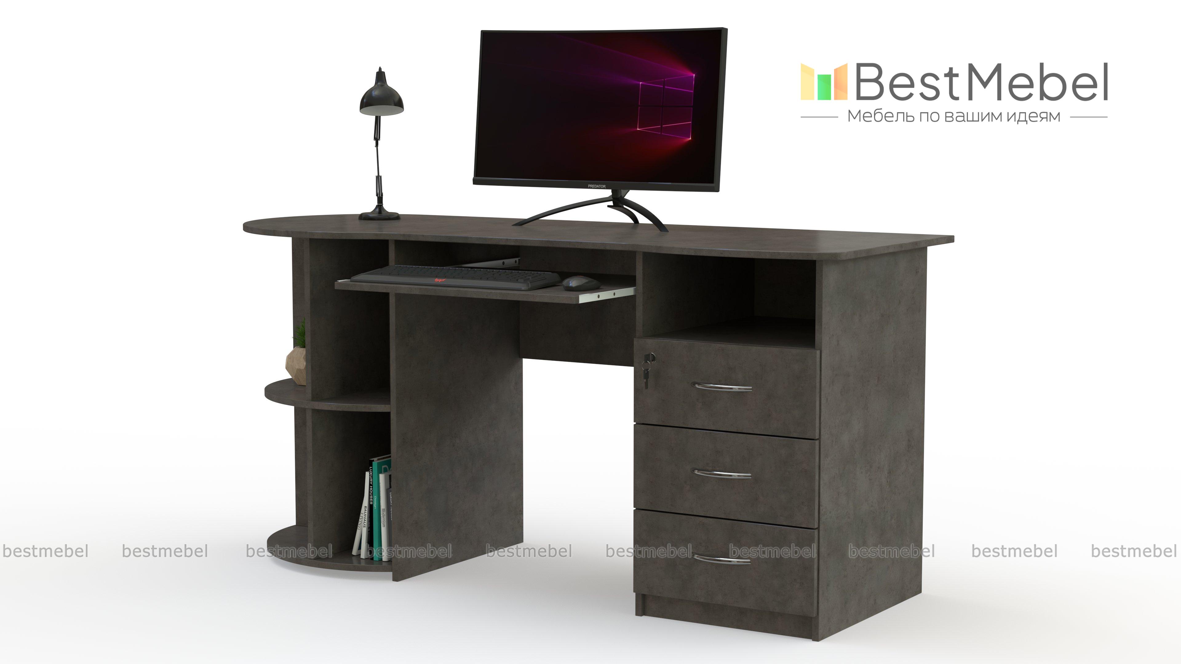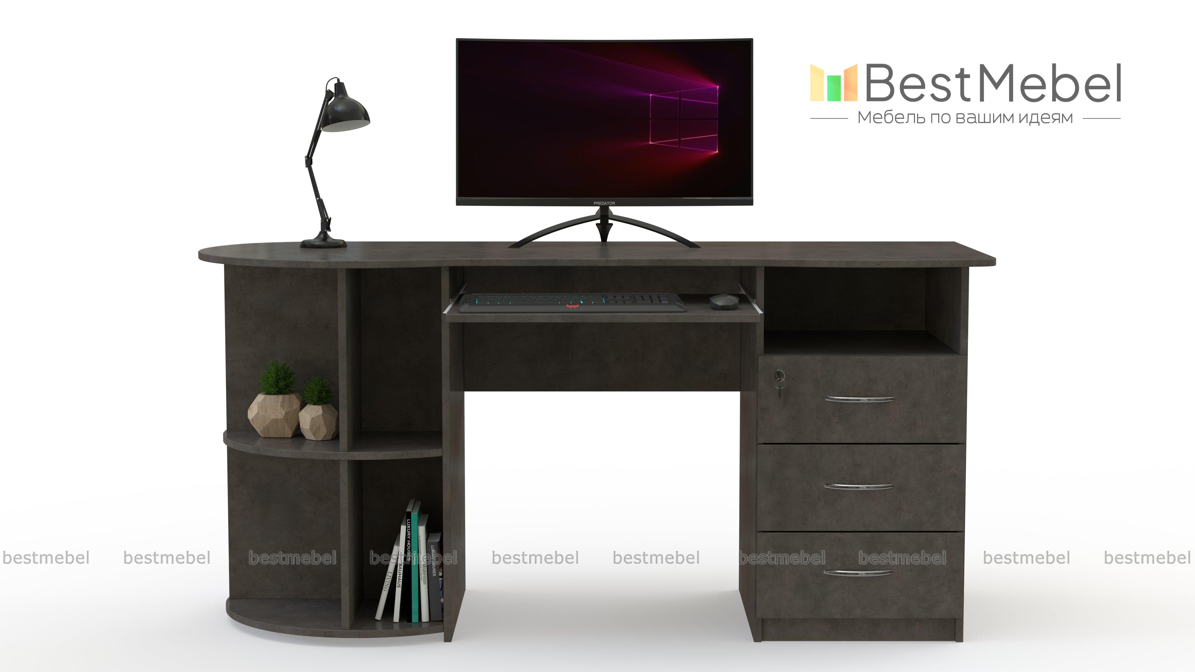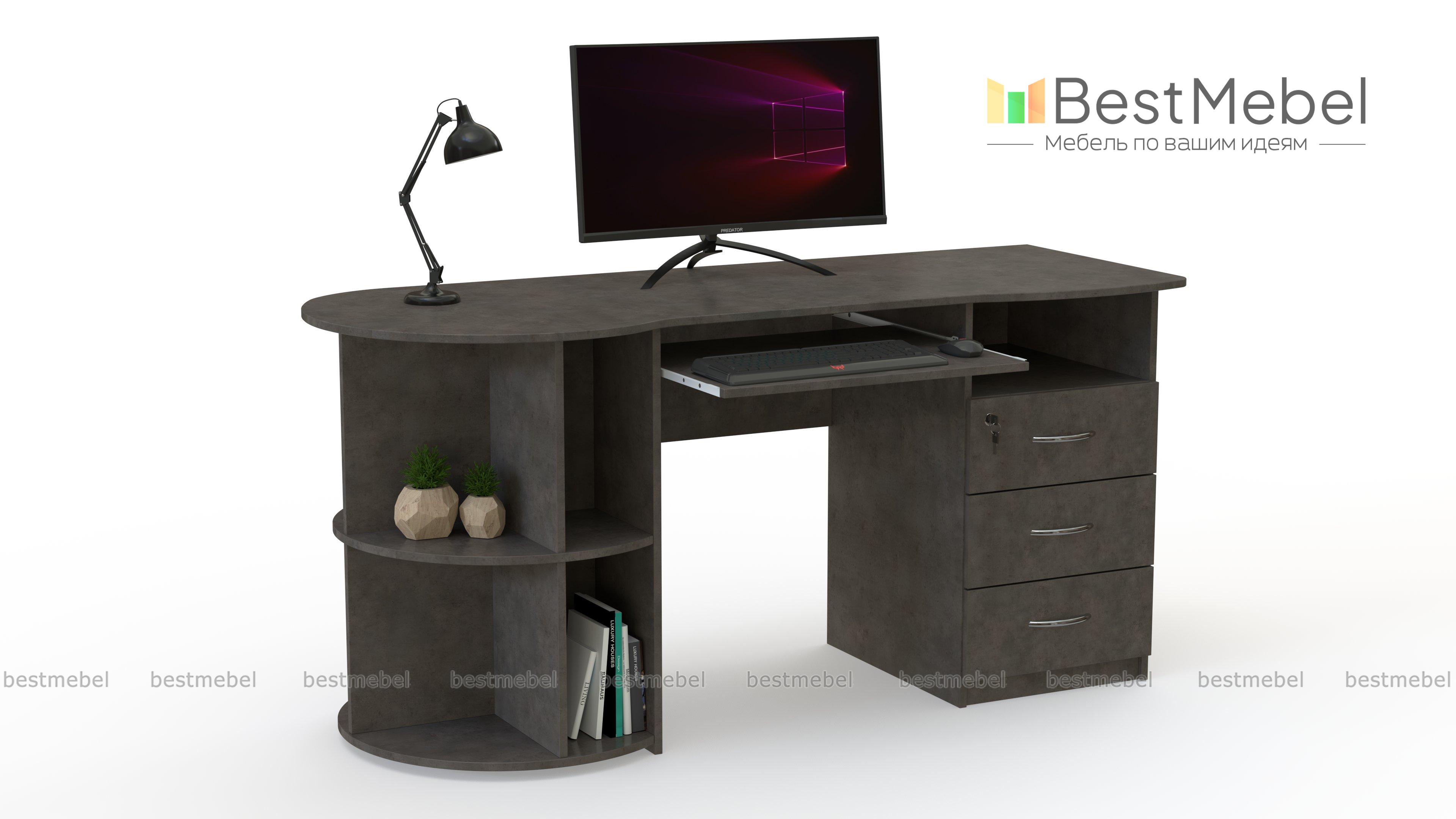 Письменный стол ПС 4002 M1 BMS оборудован радиусным стеллажом с одной стороны и тумбой, верхний ящик которой закрывается на ключ, - с другой. Эргономично вырезанная столешница без острых углов дополнена выкатной полочкой для удобного размещения клавиатуры. Модель современного дизайна органично впишется в офисный и домашний интерьер и сделает рабочий процесс комфортным. Купить письменный стол ПС 4002 M1 BMS приглашаем на сайт нашего интернет-магазина с выбором размеров и цвета по каталогу.