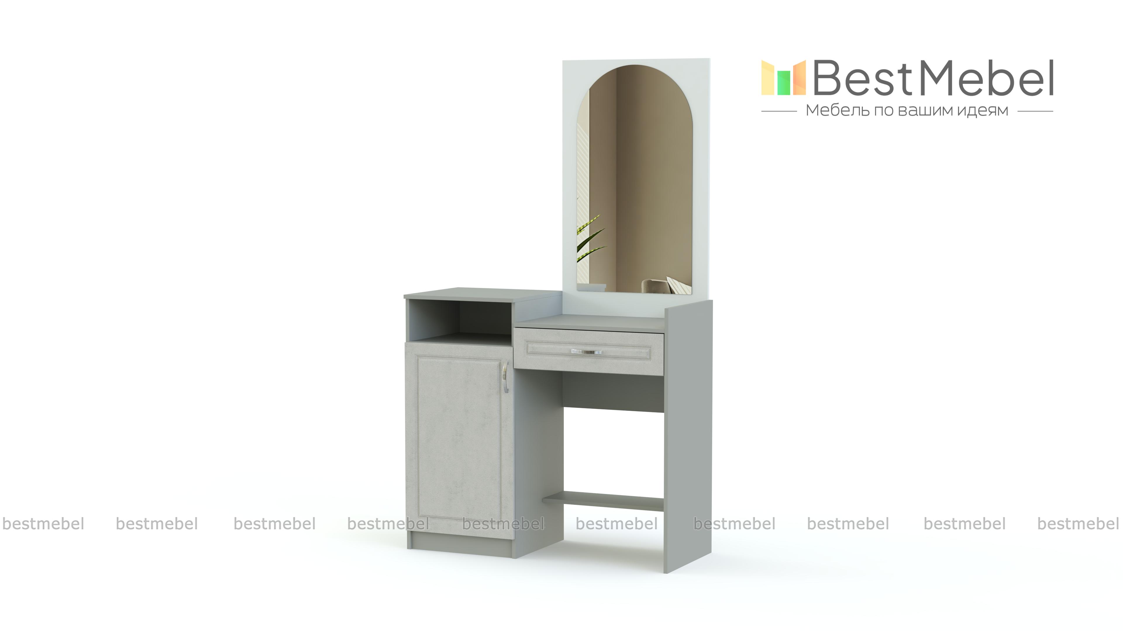 Стол туалетный Ланистер 21 BMS станет практичным дополнением современного спального гарнитура. Модель отличается компактными размерами и оригинальным дизайном. Выполненный в контрастных тонах и украшенный по фасаду фрезеровкой, столик оборудован столешницей с выдвижным ящиком для мелочей, высокой тумбой с нишей и распашным отделением и панелью со скругленным зеркалом. Купить стол туалетный Ланистер 21 BMS и разместить все необходимые уходовые средства и предметы декора вам поможет наш интернет-магазин.