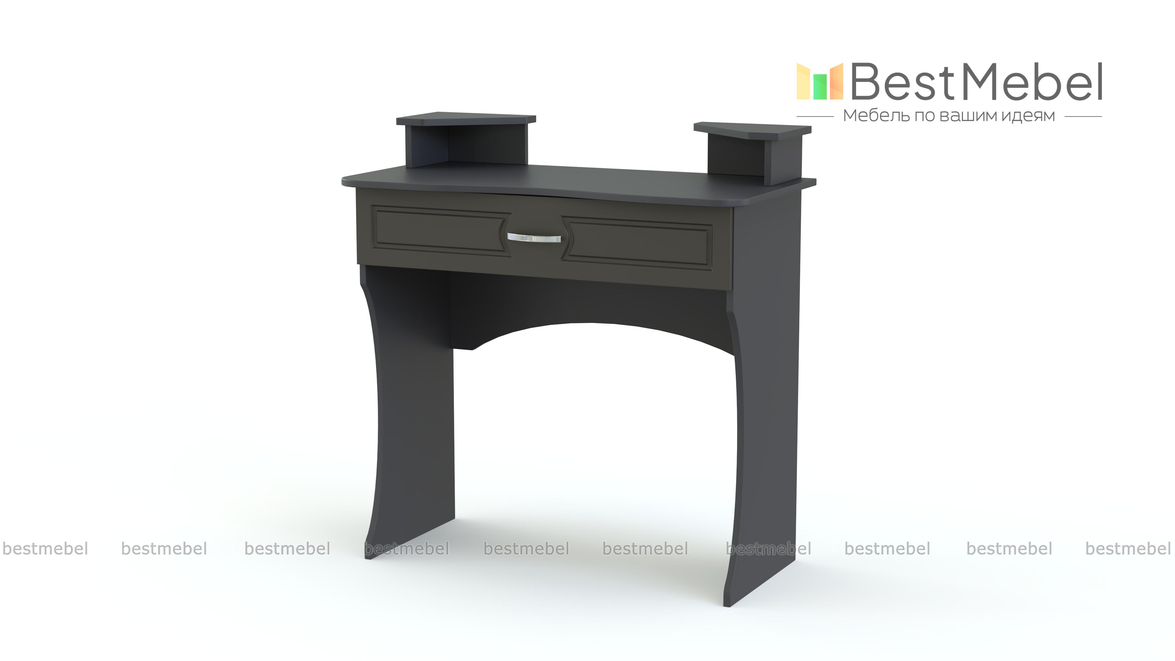 Туалетный столик Афродита 10 BMS выполнен в классическом стиле и гармонично дополнит меблировку элегантной спальни в теплых древесных тонах. Модель с фигурно вырезанными опорами оборудована эргономичной столешницей с вместительным ящиком для мелочей и двумя угловыми надстройками с полочками и нишами. Фасад ящика декорирован неброской фрезеровкой. Купить Туалетный столик Афродита 10 BMS для комфортного ухода за собой вы сможете недорого в нашем интернет-магазине.
