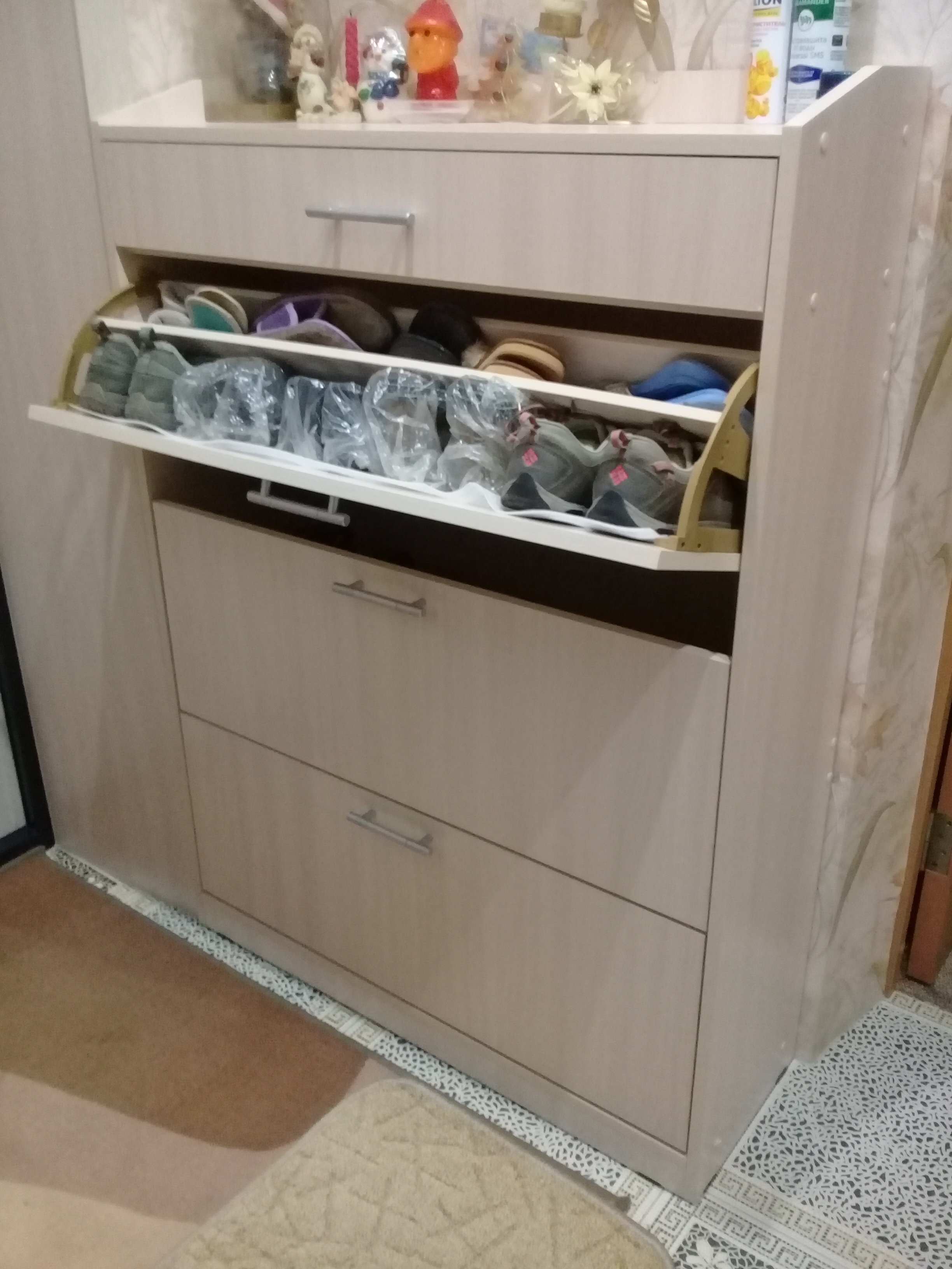 Выбирали галошницу по внешнему виду, вместительности и размерам. Принципиальны были: цвет, ящик для перчаток и бортик (что бы ничего не падало) сверху, и нестандартный размер (мы заказали в размере 900х1250х300). Все заявленые условия смогли выполнить только в компании Bestmebelshop. Галошницу используем 3 месяца. В каждый отсек помещается примерно 10 пар обуви, зимней и больших размеров до 5 пар. Если сделать галошницу 3.1 BMS повыше на 10см, то помещалось бы зимней (большого размера) обуви больше в отсек. Очень удобный и красивый бортик сверху - ничего не падает. Удобно, что можно выбрать любой цвет, можно отдельно корпуса, отдельно фасадов. Мы выбрали цвет молочный дуб и наша галошница идеально вписалась в интерьер. Удобный ящик для перчаток. Оптимальное соотношение цена-качество! Компания Bestmebelshop выполнила все свои обязательства по производству нашего заказа (00000226211): качественные материалы и фурнитура, доставка в срок. Собирали сами-всего хватило. Очень довольны! Сейчас ждём, когда привезут наш новый заказ!